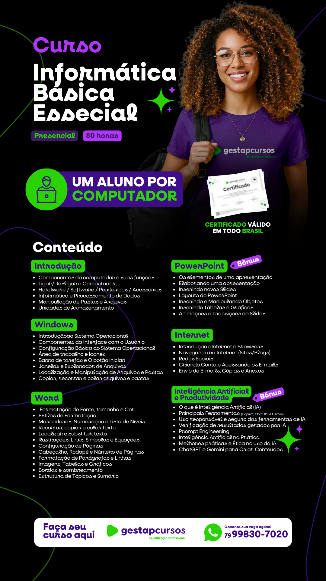 O profissional de Informática adquire habilidades importantes para atuar em diversos setores, desde o domínio de conceitos básicos de uso do computador até o manuseio de ferramentas de produtividade e tecnologia. Neste curso, você vai aprender a utilizar os principais softwares e recursos essenciais no dia a dia das empresas, como Word e PowerPoint, o sistema operacional Windows 11, navegação segura na internet, envio de e-mails, uso de Inteligência Artificial e aumento da produtividade.